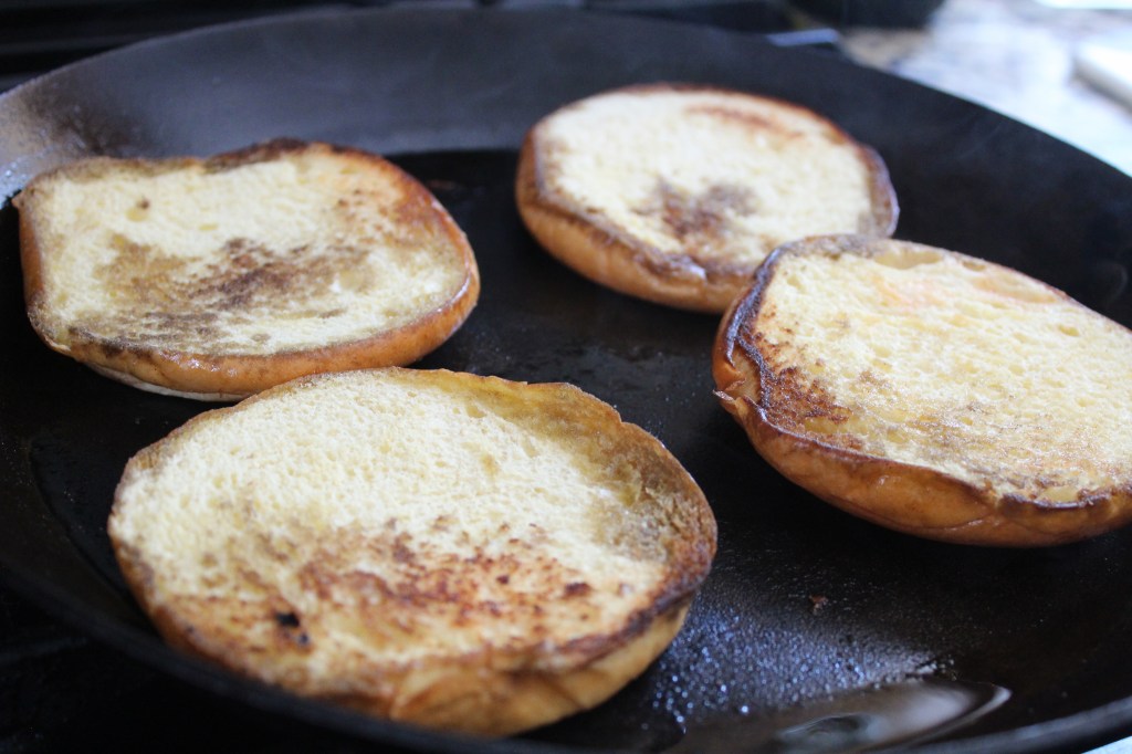 Place the 12″ skillet (or other flat surface cookware such as a Cook-It-All) on the stove and turn the heat up to 5. Drizzle 1 TBS of olive oil in the pan and let is spread as the skillet heats. Place the buns in face down, press down with the spatula, and cook for 2-4 minutes.