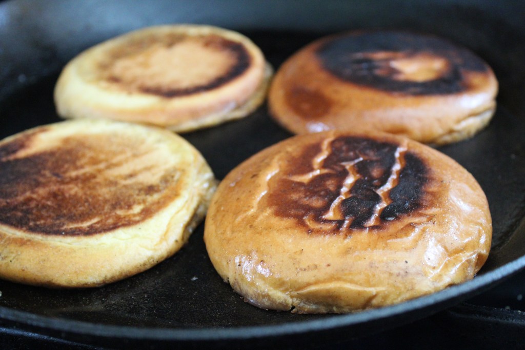 Flip the buns over. There should be crisp edge like in the photo above. Press down with the spatula, and let cook for another 2-4 minutes (the skillet should be hot by now, so watch our or they will burn). Remove from the skillet and set aside.