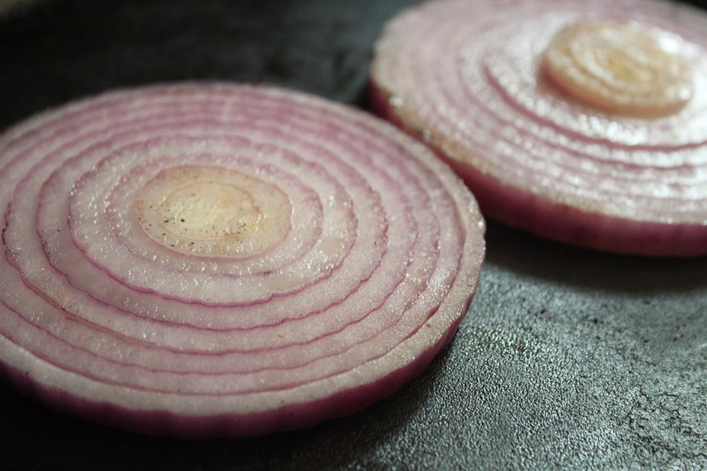 Place the onion slices in the skillet and let cook for 2-4 minutes on each side. Remove from the skillet and place aside.