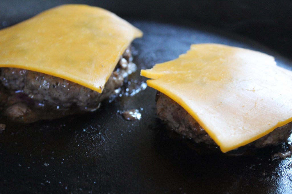 Remove the lid and place the cheese slices on top of the patties. Reminder – the stove is still off and the skillet is cooling but has some residual heat.