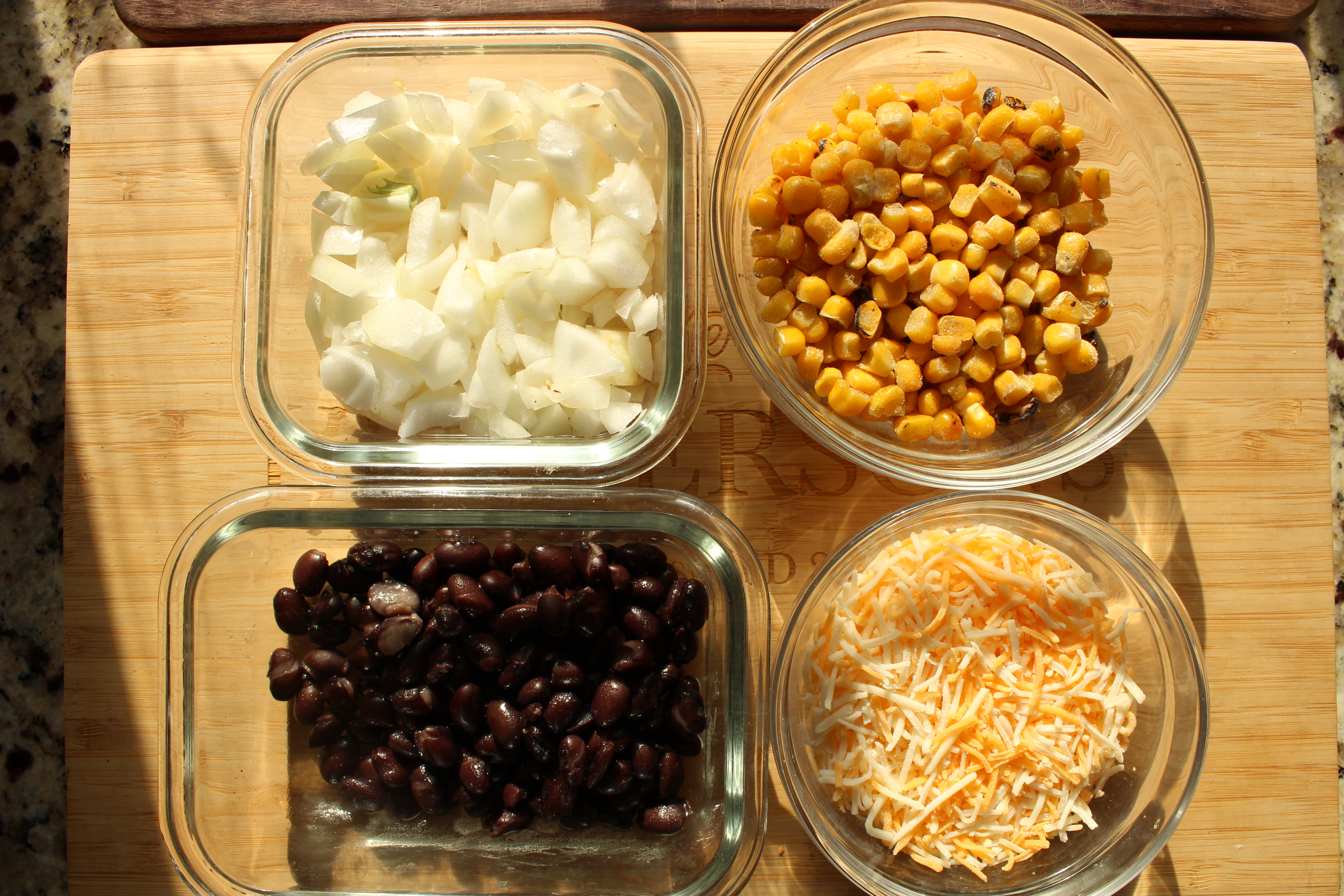 When you start seeing burn marks on the corn (after about 5-7 mins) pour the black beans in the mix. The beans will pop and break quickly, so turn the heat down to 3 or 4. Put a few good shakes of some taco seasoning (enough to see red flecks throughout) and stir the batch around. Let cook for 2-3 mins together. Once done, remove mix and set to the side.
