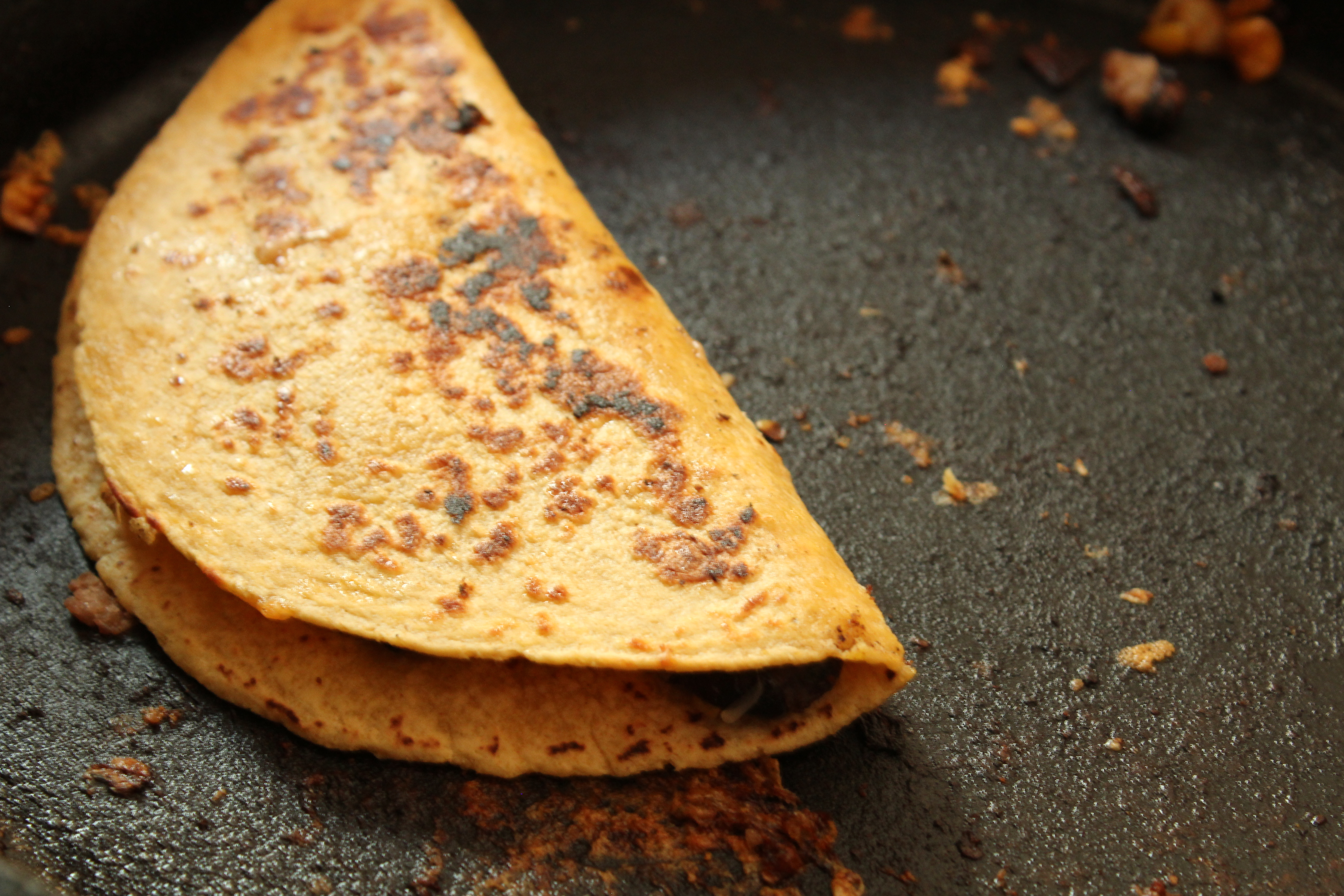 Flip the taco over and let cook for another 2-3 minutes. You should see some brown marks on the shell.