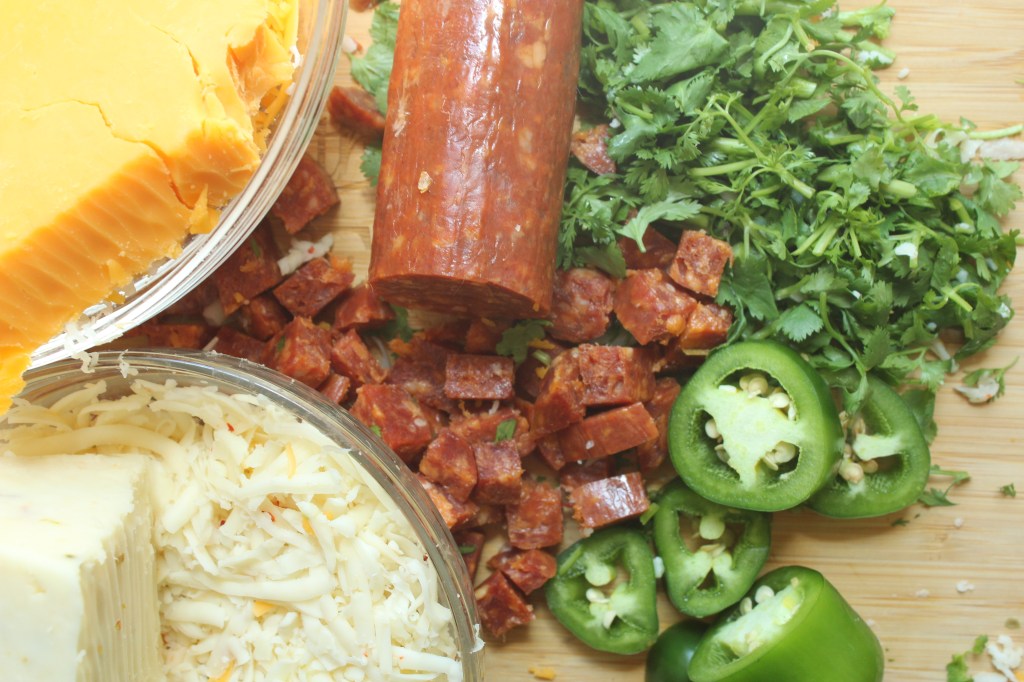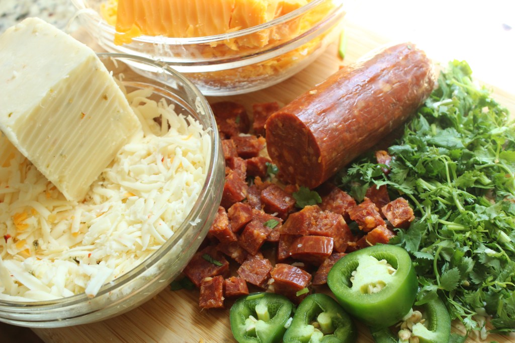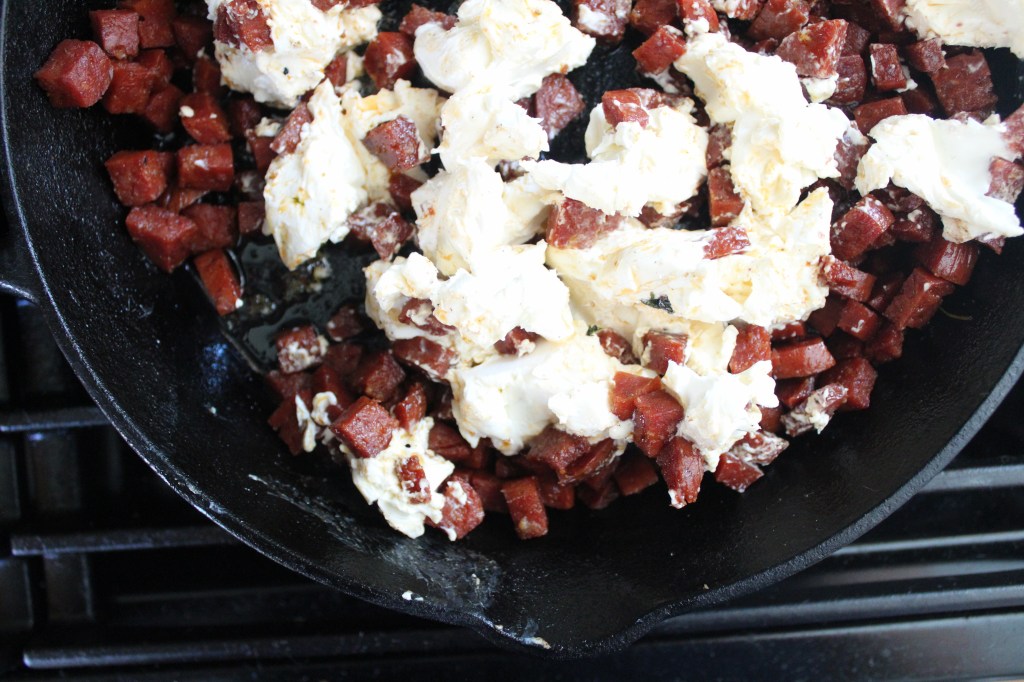 Once complete, set the cheese aside. Remove the casing from the chorizo and dice into pieces. If you have a meat grinder, you can also grind the chorizo on a medium setting.