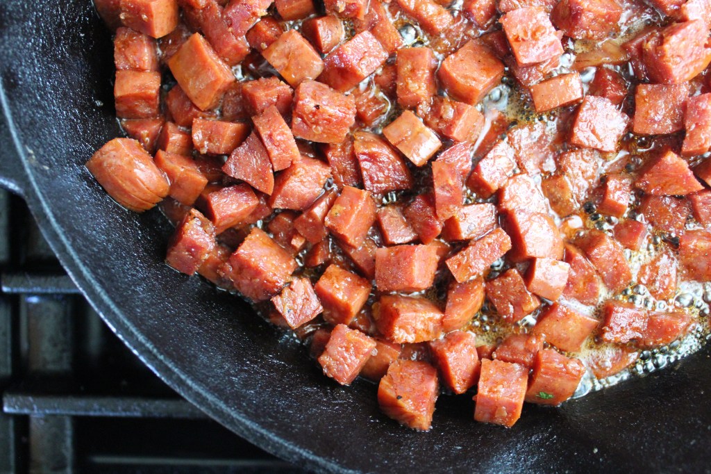 Place the skillet on the stove, pour in 1TBS of olive oil, and turn the heat up to 5. Once the oil spreads, put the chorizo in and cook until browned, 5-7 minutes. Stir throughout, and then drain the grease using a slotted spoon.