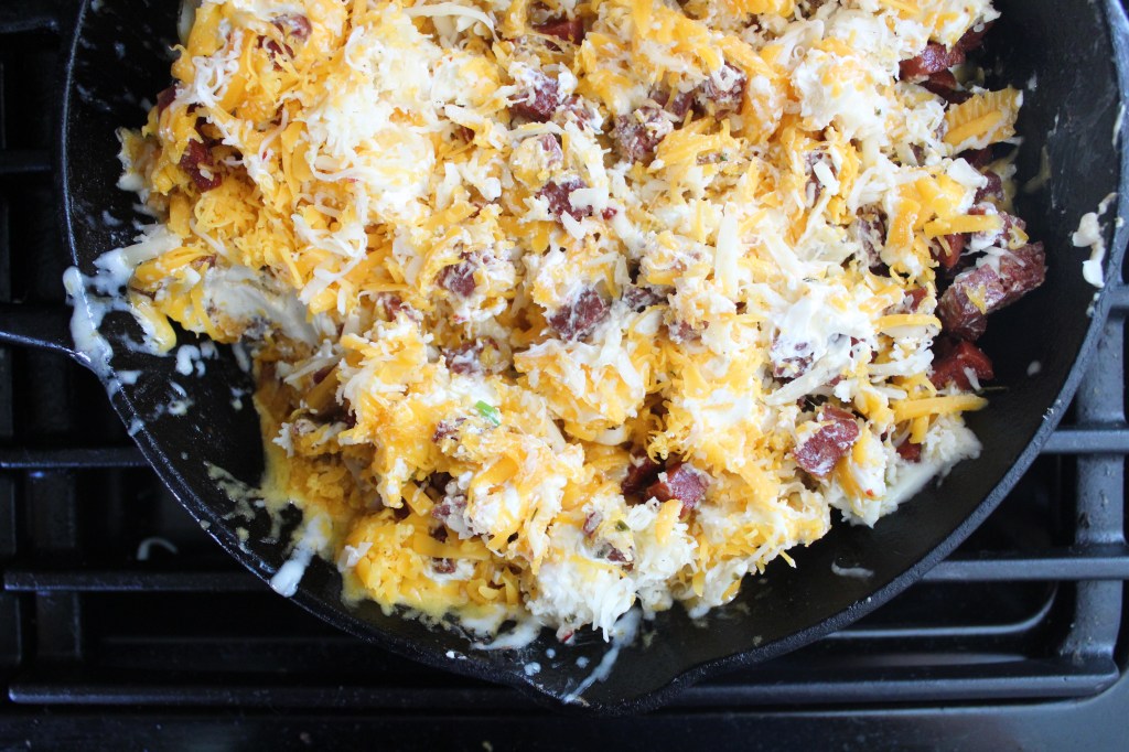 Next, place the cream cheese in the skillet, then the shredded cheddar and pepper jack cheese in. Stir to combine.