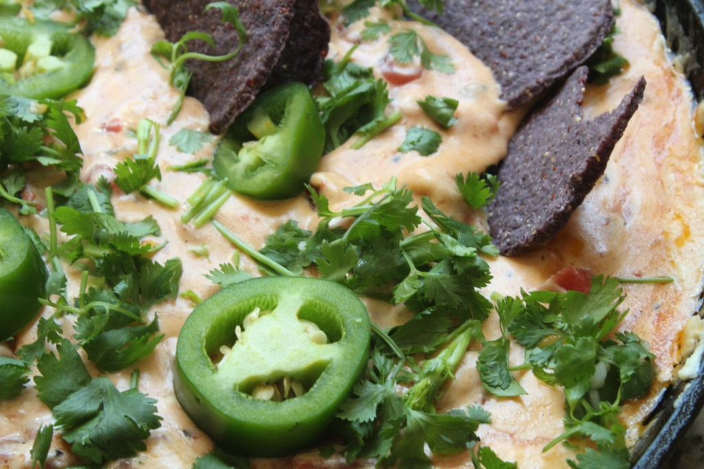 Finally, garnish with the cilantro, jalapenos, and chips. Serve straight out of the skillet. Impress your friends, fans of your team, fans of the other team, and other home chefs. Enjoy responsibly.