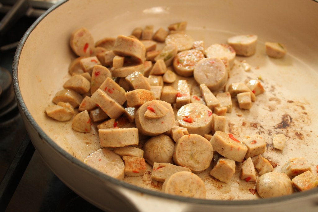 Grab an enameled cast iron Dutch oven and turn the stove up to 5. Put a big spoonful of olive oil in to coat the bottom. Cook the chicken sausage for 5-10 minutes until browned. Remove the sausage from the skillet and set aside.