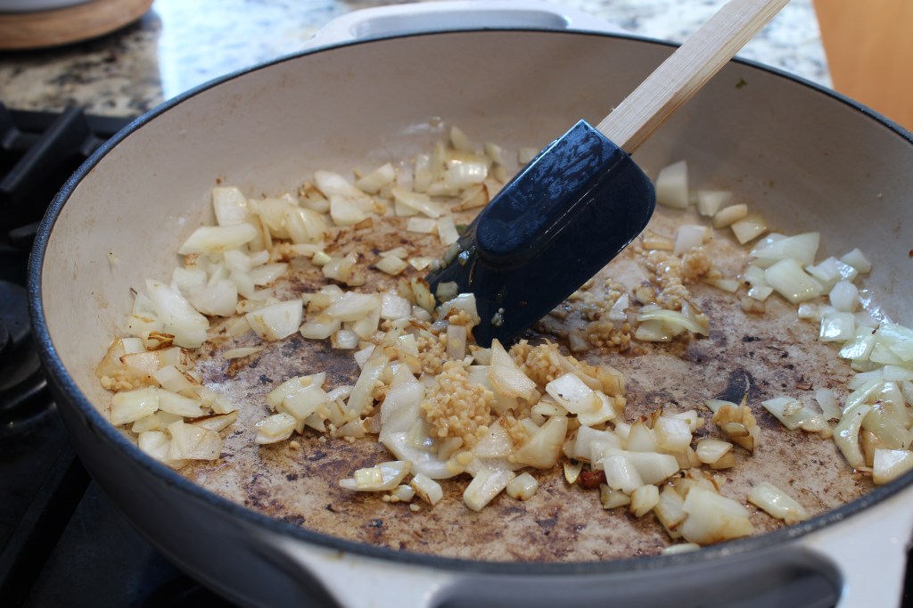 - Cook the diced onion in the Dutch oven for 5-7 mins. Add in the minced garlic and cook for 1-3 minutes or until fragrant.