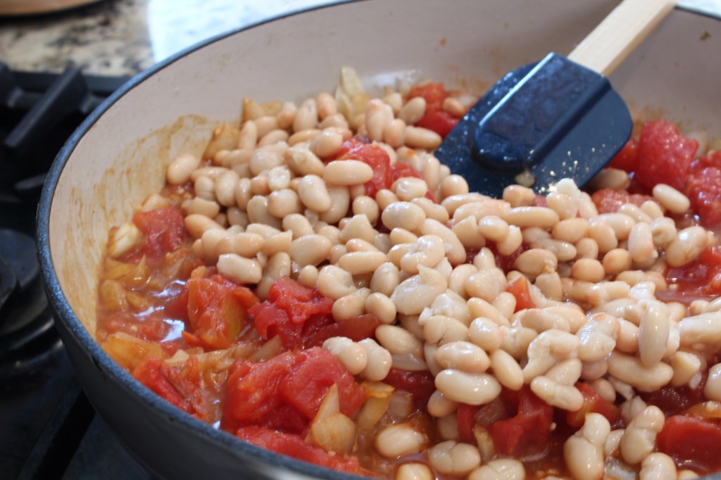 Go ahead and open all of the cans. Rinse the white beans in a colander and set aside.