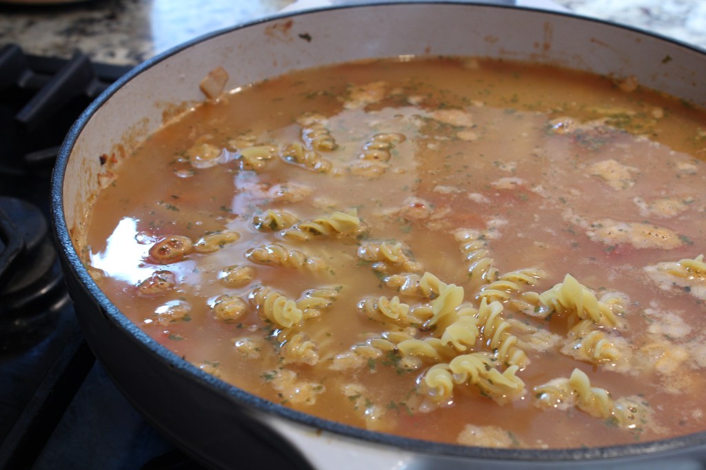 - Pour in the tomatoes (with the juice), beans (rinsed and drained), chicken stock, pasta, and spice mix into the Dutch oven. Stir and bring to a boil. Once boiling, lower stovetop heat and let simmer for 20 mins. Cover with a lid, removing occasionally to stir.