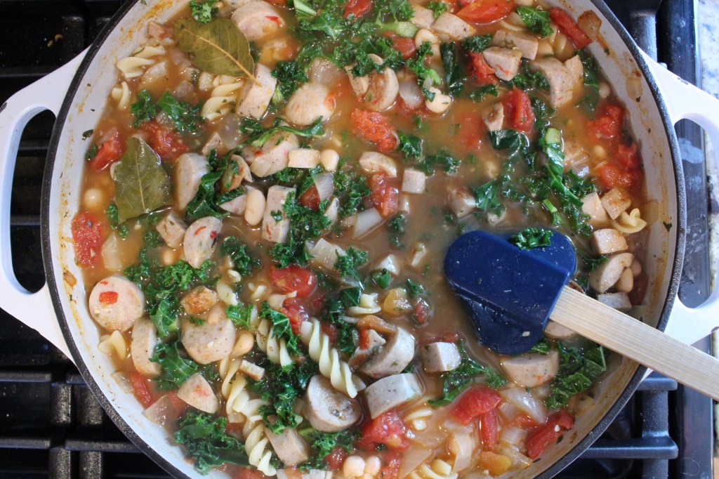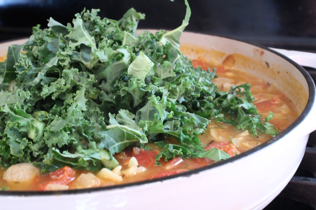 - Place the kale and chicken sausage into the soup and stir. Let the meal simmer for 3-5 minutes for flavors to blend. Serve and enjoy!