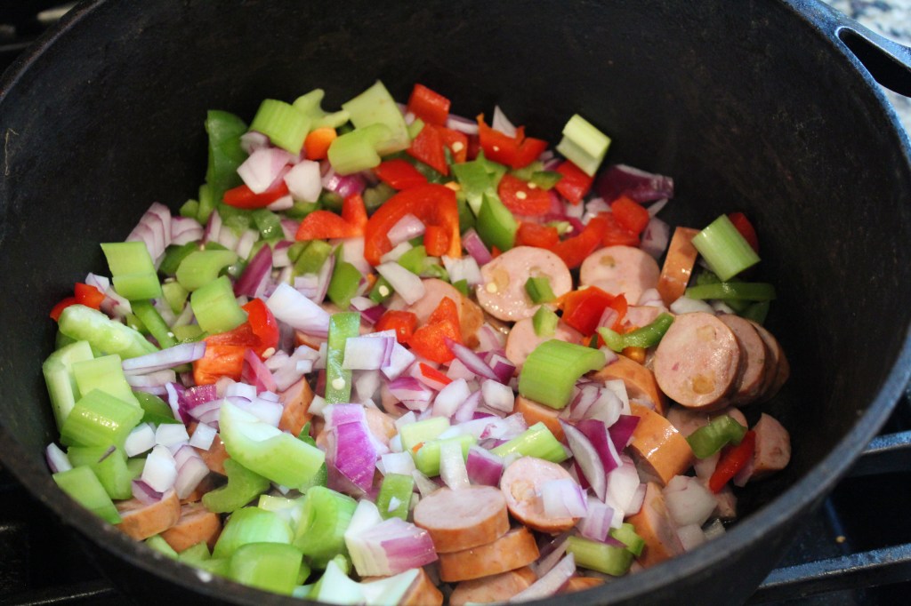 Once the sausage is browned, place the onions, peppers, and celery into the Dutch Oven and stir. Cook for another 5-7 minutes or until vegetables are soft. Season the vegetable mix with Cajun seasoning, salt, and thyme.