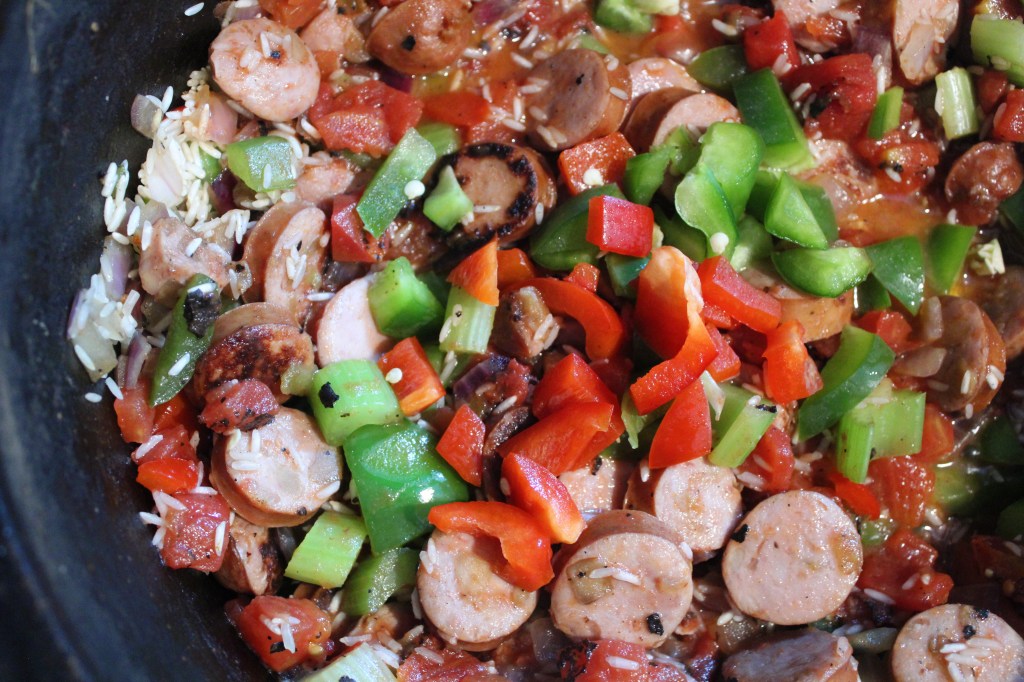 Place 1TBS of olive oil in and let it coat evenly. Start cooking by placing the andouille sausage coins in and cooking for 5-7 minutes or until browned. This will allow the flavor to begin to permeate through the entire jambalaya.